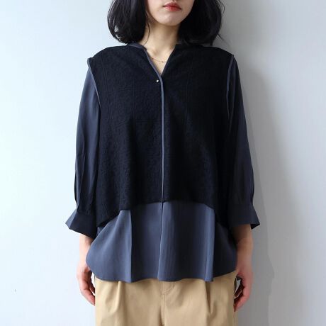 まるでレースのベストを重ねたような、一枚でコーディネートが完成するドッキングデザイン。