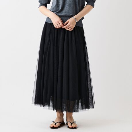 甘くなりすぎない洗練されたデザインで、幅広いスタイルに合わせやすい大人のチュールスカートです。
