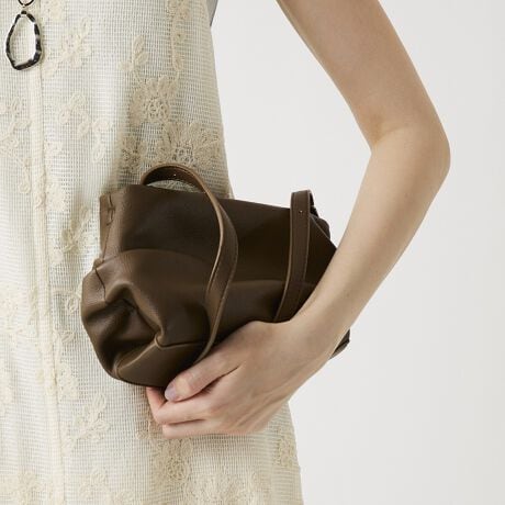 ショルダーバッグとして斜めがけし、スカートやデニムワイドパンツと合わせて頂くと、クシュクシュ感が大人かわいいアクセントとなり、抜け感のあるカジュアルスタイルが完成します。