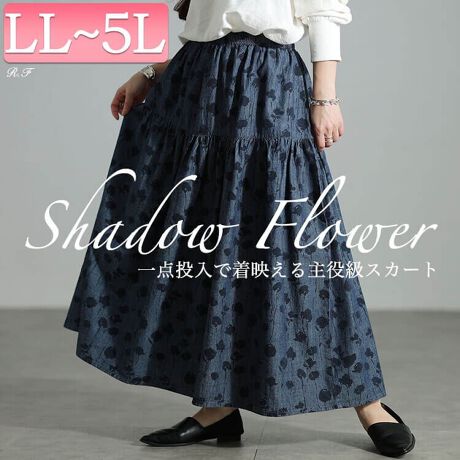 【大きいサイズ】 コットンシャンブレー花柄ティアードスカート 大きいサイズ レディース スカート