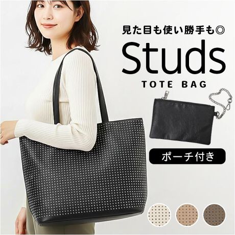 【キラリと映えるトート】メタリックストーンが光るA4対応のポーチ付き大容量バッグ。【A4が入るたっぷり収納力】書類やノートPCもすっぽり入る大容量◎【ストーンが放つ上品な輝き】さりげなくあしらわれたメタリックストーンが光を受けてキラリと映え!【ポーチ付きで小物もすっきり】付属のミニポーチにリップやカード類をまとめれば、バッグの中が散らからず取り出しもスムーズ♪【自立する頼もしいフォルム】しっかりした底面で床に置いても倒れず、カフェやオフィスでスマートに使える〇【小物ポケット充実】内側も外側もポケットがあるから、小物を分けて収納できる。【長く愛用できる、予備ストーン】スタッズが取れてしまっても安心の、予備ストーンをセットに。自分で取りつけできる説明付き?