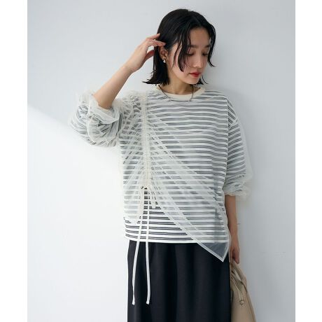 重ねたように見えて、着心地は軽やかシャーリングを施したチュール素材を重ねたデザインが、さりげなく華やぎを添えてくれます。レイヤード風の見え方で、いつものコーディネートを簡単にアップデートできるのが魅力です。ベースはシンプルなプルオーバーなので、甘くなりすぎず上品なカジュアルスタイルが完成します。透け感のあるチュールが動きに合わせて軽やかに揺れ、女性らしい柔らかな印象を演出します。体のラインを拾いにくく、自然に体型をカバーできるのも嬉しいポイントです。パンツにもスカートにも合わせやすく、着回し力の高い一枚として活躍します。日常使いからちょっとしたお出かけまで、幅広いシーンに取り入れやすいアイテムです。透け感[ややあり]