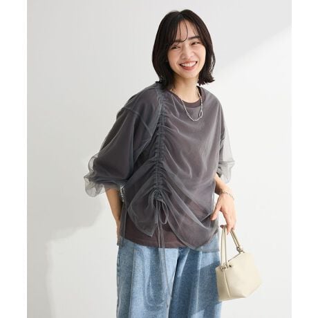重ねたように見えて、着心地は軽やかシャーリングを施したチュール素材を重ねたデザインが、さりげなく華やぎを添えてくれます。レイヤード風の見え方で、いつものコーディネートを簡単にアップデートできるのが魅力です。ベースはシンプルなプルオーバーなので、甘くなりすぎず上品なカジュアルスタイルが完成します。透け感のあるチュールが動きに合わせて軽やかに揺れ、女性らしい柔らかな印象を演出します。体のラインを拾いにくく、自然に体型をカバーできるのも嬉しいポイントです。パンツにもスカートにも合わせやすく、着回し力の高い一枚として活躍します。日常使いからちょっとしたお出かけまで、幅広いシーンに取り入れやすいアイテムです。透け感[ややあり]