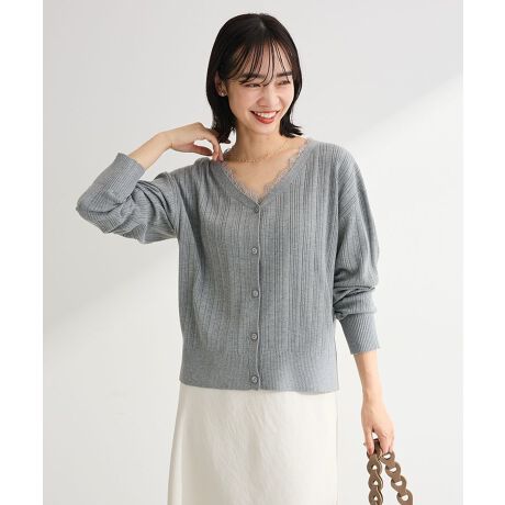 オンもオフも華やぐレース襟繊細なレースをドッキングしたデザインが印象的なニットカーディガンです。Vネックラインからのぞくレースがデコルテを美しく見せ、上品でやわらかな雰囲気を演出します。縦リブ編みが身体のラインをすっきり整え、ジャケットインにも使いやすいコンパクトなシルエットです。カーディガンとしてはもちろん、前を閉じてトップス感覚で着られるため、コーディネートの幅が広がります。オフィスカジュアルから休日のお出かけまで幅広いシーンに対応し、毎日の装いをさりげなく格上げしてくれます。上品カジュアルを楽しみたい方におすすめです。透け感[なし]