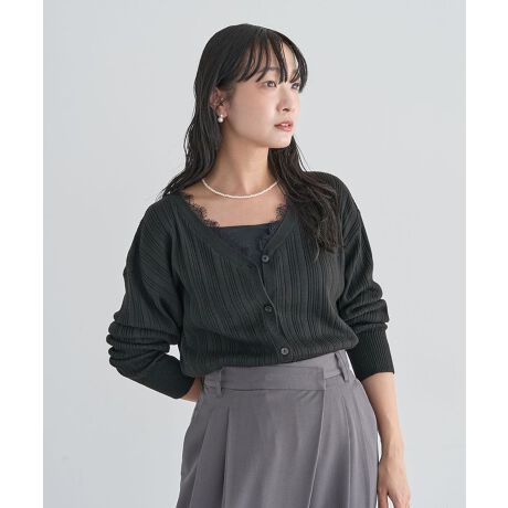 オンもオフも華やぐレース襟繊細なレースをドッキングしたデザインが印象的なニットカーディガンです。Vネックラインからのぞくレースがデコルテを美しく見せ、上品でやわらかな雰囲気を演出します。縦リブ編みが身体のラインをすっきり整え、ジャケットインにも使いやすいコンパクトなシルエットです。カーディガンとしてはもちろん、前を閉じてトップス感覚で着られるため、コーディネートの幅が広がります。オフィスカジュアルから休日のお出かけまで幅広いシーンに対応し、毎日の装いをさりげなく格上げしてくれます。上品カジュアルを楽しみたい方におすすめです。透け感[なし]