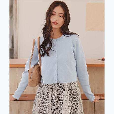 ・クリア釦のデザインのニットカーディガン・リネンライクな風合いのニット素材・春夏に嬉しいUVケア機能があり、お手入れ簡単な素材なのでデイリーで大活躍・シンプルながらもコーディネートのアクセントになるアイテムです[型番:AHXT0500]
