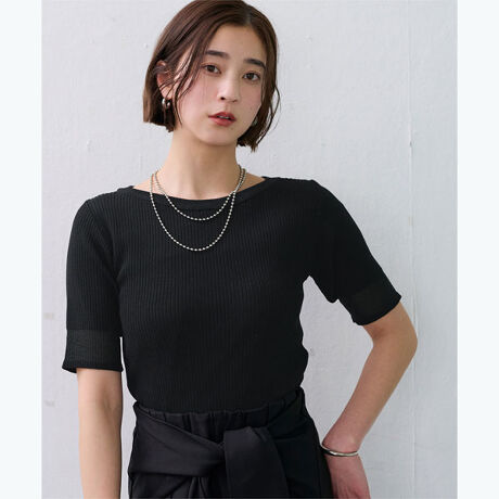袖口シアー5分袖リブニット