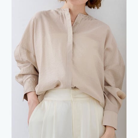 バックスタイルにふんわりと広がるフレアをあしらった、動きのあるシアーデザインが魅力のシャツ。ほどよく透け感のある素材が軽やかな印象を与え、カジュアルなスタイリングに抜け感をプラスします。前はシンプルなバンドカラーで大人っぽく、後ろ姿でさりげなく華やかさを演出。ゆったりとしたシルエットでリラックス感があり、デイリー使いにぴったりの一枚です。[型番:BHXU1957]