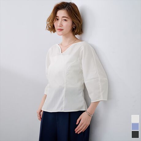デコルテを美しく引き立てるハートネックデザインが魅力のブラウス。程よいハリ感のある素材がシルエットをきれいに保ち、女性らしい立体感を演出します。一枚で顔まわりが華やぎます。オフィスやお出かけにもおすすめです。[型番:BHXU2057]