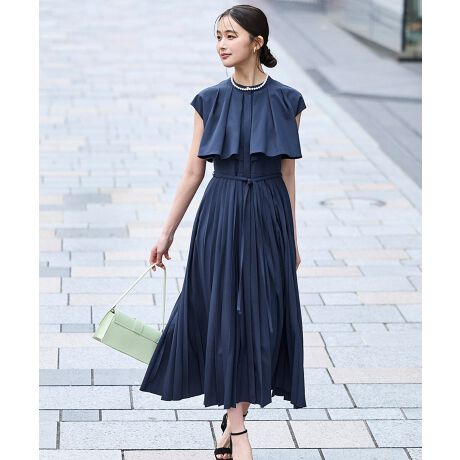 ケープとプリーツのバランスが美しいスタイルアップワンピース。