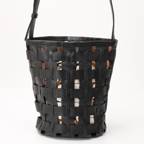 バリ産のナチュラルレザーを使用した、編み込みメッシュのバケツ型ショルダーバッグ。
