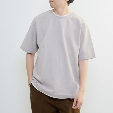 表情豊かなダブルフェイスの鹿の子編みと、ベーシックな天竺素材を組み合わせたフェイクレイヤード仕様。