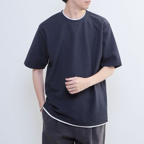 表情豊かなダブルフェイスの鹿の子編みと、ベーシックな天竺素材を組み合わせたフェイクレイヤード仕様。