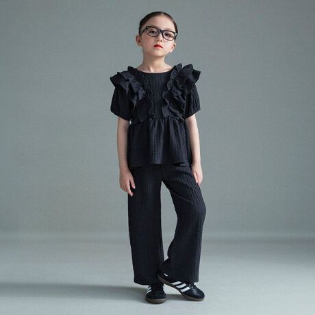 ポコポコとした表面感のある素材が目を引く、トップスとパンツのセットアイテム