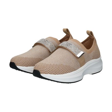 カジュアルなニット素材で仕立てたスニーカーに、キラキラと輝くラインストーンベルトを組み合わせた、大人かわいいデザインの一足。