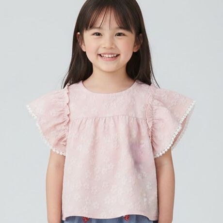 サクラがさりげなく入っている総柄のチュニックです。繊細なレーステープやフリルを袖にあしらいました。バックネックはゴム仕様なのでお着替えもラクラク。シンプルなワンカラーのため、日常のコーディネートに取り入れられます。