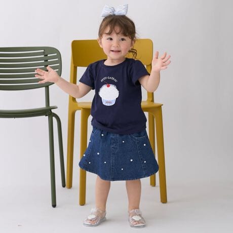 カジュアルなデニム生地にフェイクパールをちりばめた上品な印象のスカパンです。