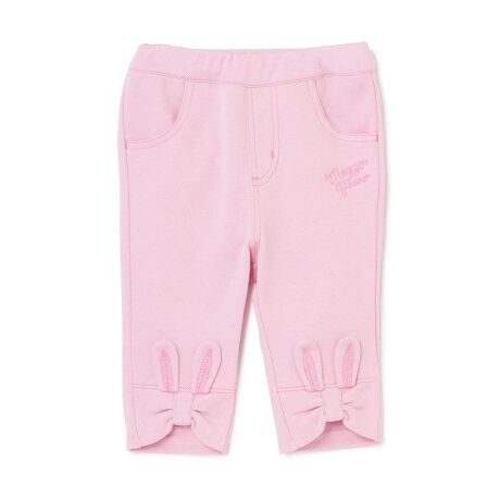 裾のリボンとうさぎの耳がかわいい7分丈のパンツです。はきやすいカットソー生地を採用しお着替えの多いベビーにピッタリのアイテム。フロントのファスナー風ステッチで、デニムパンツさながらのデザインに仕上げました。トップスの合わせに困らないため、デイリーユースにおすすめです。内側にお名前を記入できるタグつき。