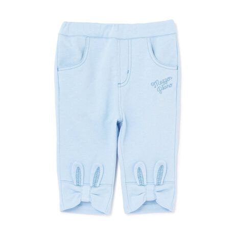 裾のリボンとうさぎの耳がかわいい7分丈のパンツです。はきやすいカットソー生地を採用しお着替えの多いベビーにピッタリのアイテム。フロントのファスナー風ステッチで、デニムパンツさながらのデザインに仕上げました。トップスの合わせに困らないため、デイリーユースにおすすめです。内側にお名前を記入できるタグつき。