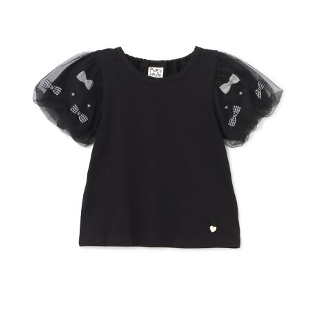 チュールの透け感やバルーンスリーブの膨らみがかわいいTシャツです。リボンとフェイクパールを閉じ込めた個性的なデザイン。バックネックにはゴムが入っており、お着替えも簡単に行えます。フリルスカートからデニムパンツまで、幅広いテイストのボトムスと好相性です。