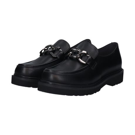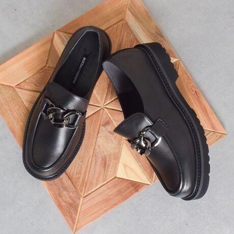 存在感のあるメタルチェーンが目を引くレザーローファーは、カジュアルからきれいめまで幅広いスタイルに合わせやすく、長時間歩いても疲れにくい快適な履き心地です。