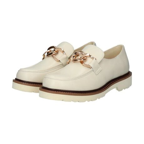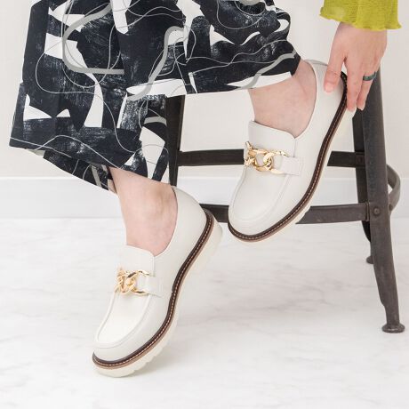 存在感のあるメタルチェーンが目を引くレザーローファーは、カジュアルからきれいめまで幅広いスタイルに合わせやすく、長時間歩いても疲れにくい快適な履き心地です。