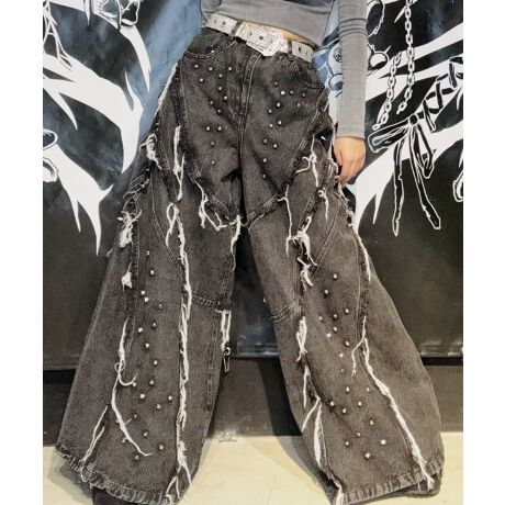 インパクト抜群のスタッズ加工やフリンジ加工、極太ワイドシルエットがポイントのストリート感溢れる一枚。