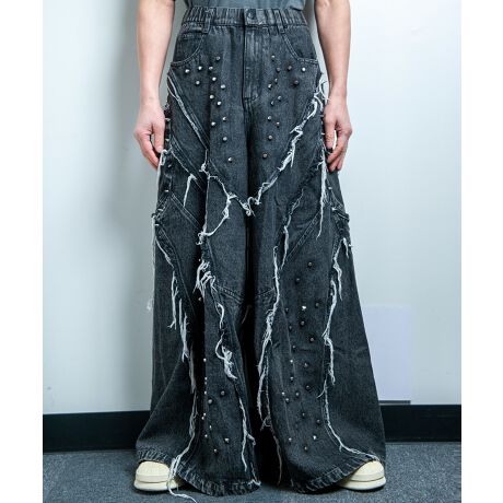 インパクト抜群のスタッズ加工やフリンジ加工、極太ワイドシルエットがポイントのストリート感溢れる一枚。