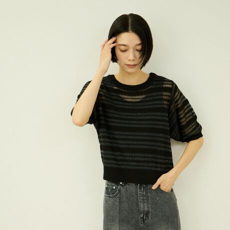ボディ全体に施された繊細な編み柄と、淡いボーダー調の切り替えがナチュラルな雰囲気を演出します。