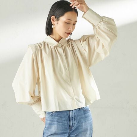 肩のタックや贅沢なギャザーを施し、一枚で着映えするアイテムです。
