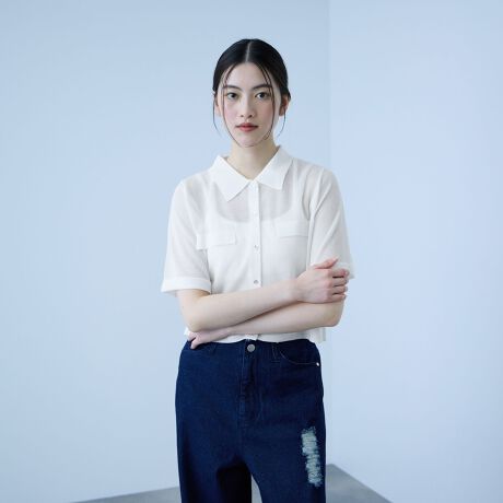 襟付きのクリーンなルックスは、カジュアルにもきれいめにも合わせやすく、デニムとの相性も抜群。