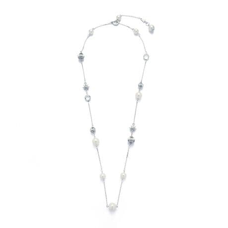 パールやカットガラスなどさまざまなパーツの中に星モチーフを効かせたロングネックレス。