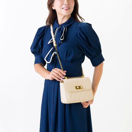 フロントの金具とラウンドのキルティングが印象的なポシェットです。