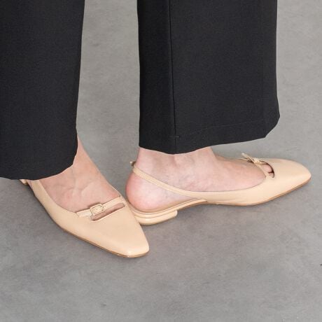 華奢なバックバンドが女性らしい印象を演出。履き口のストラップデザインがアクセントとなり、足元をすっきり見せてくれます。