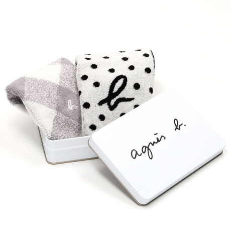 人気の水玉にb.ロゴがアクセントになった定番デザインと使いやすいバイアスチェックのタオルハンカチ2枚がアフターユースできる缶のパッケージに入ったギフトセットです。