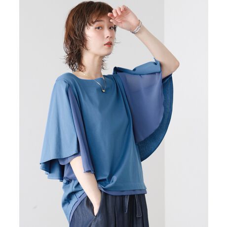 人気のWシルケットシリーズからキレイ目のブラウス感覚で着れるプルオーバーがNEW IN!お袖のフレアは腕回りをさり気無くカバーアップしてくれます。ふんだんにフレアを入れながらもさり気無く肘にかけて長く設定している為、隠したい部分は隠しつつも軽やかな印象に。透け感のあるシアー素材をお袖の前側に入れることで風通しもよくオシャレなだけでなく暑い夏も軽やかに華やかにオシャレを楽しんで♪裾もシアー素材を入れた、さり気無く細部までに夏に着たいこだわったプルオーバーです。