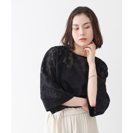 やさしく透ける表情が魅力の、レースジャガードチュニック。繊細な柄が全体に広がり、シンプルなコーデにも自然な華やかさを添えてくれます。浅めのボートネックが首元をすっきり見せ、女性らしい抜け感を演出。ゆったりとしたサイズ感とドルマンスリーブで、体のラインを拾いにくくリラックスした着心地に仕上げました。腰まわりまでカバーする丈感で安心感もあり、パンツにもスカートにもバランスよく合わせられる一枚です。