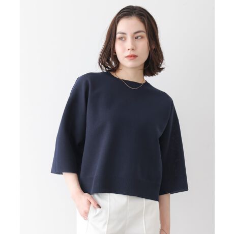 総針編みでしっかりと目が詰まった編地は、ニットなのにほどよいハリがあり、だらっと見えないのが魅力。適度な厚みがあり、季節の変わり目にも活躍します。さらにニットならではの伸縮性で動きやすく、長時間着てもストレスフリー。さらっと着られて、きちんと見える。そんな頼れる素材感です。