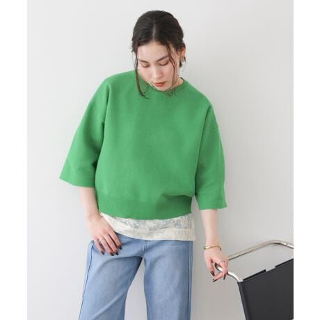 総針編みでしっかりと目が詰まった編地は、ニットなのにほどよいハリがあり、だらっと見えないのが魅力。適度な厚みがあり、季節の変わり目にも活躍します。さらにニットならではの伸縮性で動きやすく、長時間着てもストレスフリー。さらっと着られて、きちんと見える。そんな頼れる素材感です。