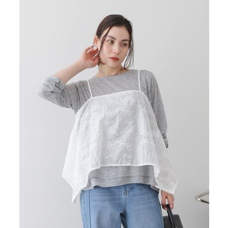 繊細なパッチワーク刺繍が目を引く、春らしい軽やかなキャミソール。TシャツやロンT、薄手ニットに重ねるだけでコーデがぐっと華やぎます。脇にたっぷりと生地を使ったデザインなので、動くたびにふわっと揺れるシルエットが生まれ、涼しげで女性らしい印象に。刺繍の可愛らしさに加えて、布部分にはほんのり光沢感があり、大人のきれい見えも叶えてくれます。重ね方次第で季節をまたいで楽しめる、着こなし自由な一枚です。