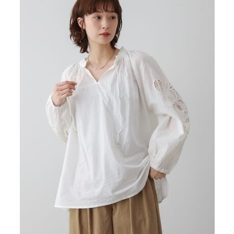 やさしい雰囲気をまとえる、大人のためのナチュラルブラウス。袖にあしらったカットワークレースが目を引き、シンプルな中にもさりげない華やかさを添えてくれます。襟元は切りっぱなし風のデザインにキーネックを合わせ、ほどよい抜け感のある仕上がりに。ゆとりのあるシルエットで体のラインを拾いにくく、気になる部分を自然にカバーしてくれるのも嬉しいポイントです。パンツにもスカートにも合わせやすく、日常のコーデをやさしく引き立てます。