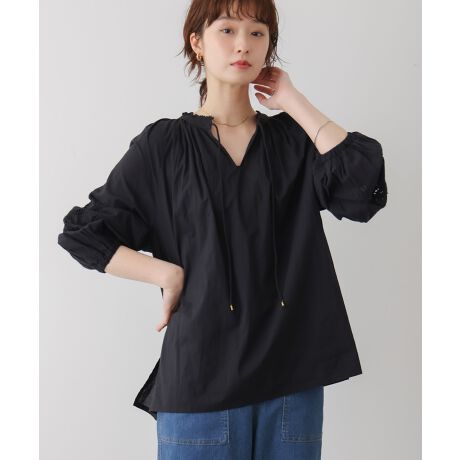 やさしい雰囲気をまとえる、大人のためのナチュラルブラウス。袖にあしらったカットワークレースが目を引き、シンプルな中にもさりげない華やかさを添えてくれます。襟元は切りっぱなし風のデザインにキーネックを合わせ、ほどよい抜け感のある仕上がりに。ゆとりのあるシルエットで体のラインを拾いにくく、気になる部分を自然にカバーしてくれるのも嬉しいポイントです。パンツにもスカートにも合わせやすく、日常のコーデをやさしく引き立てます。