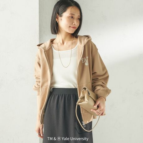 ダブルジップのフーディーにアメリカの名門校YALE大学のロゴモチーフのグラフィックをプリントしたスウェット。