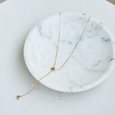 2つのハートモチーフがアクセント。モチーフがスライド式で長さ調整ができ、Y字シルエットとしても楽しめます。