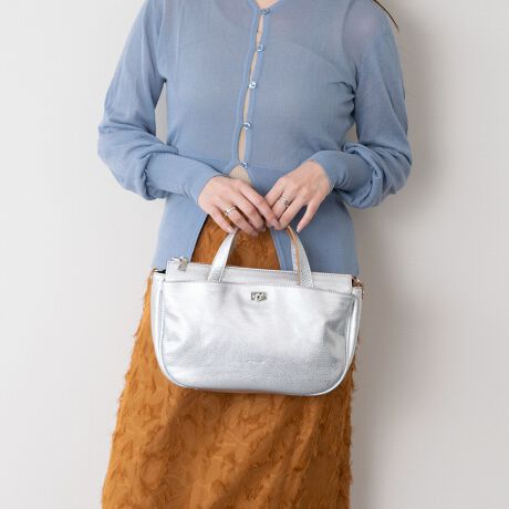 細かなエンボス加工が輝きを引き立てる「シャインシルバーレザー2WAYバッグ」。