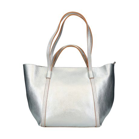 上品な輝きが印象的なシルバーカラーのダブルハンドルトートは、きちんと感と実用性を兼ね備えた一品です。