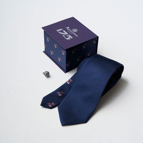 本モデルの主役は、ポップアーティスト・ハタヤママサオ氏が描き下ろした「175周年限定テディベア」。ブランドの象徴であるクラブチェックと高貴なパープルを纏ったアートなテディベアを、贅沢に「小剣」へと配置しました。一見すると端正なソリッド(無地)タイでありながら、ふとした瞬間に小剣から覗くテディベアが、大人の余裕と祝祭感をエレガントに演出します。 今しか手に入らない、アニバーサリーだけの特別な意匠