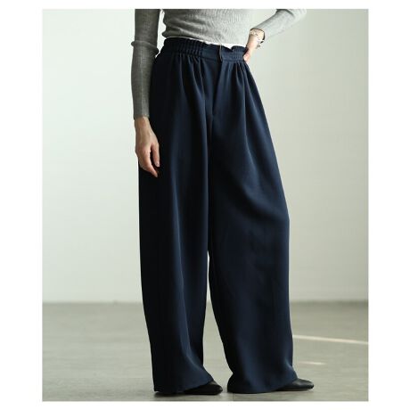 【パンツ】 ワイド ロング タック ハイウエスト ウエストゴム レイヤード風 無地 ピンク 紺 黄色