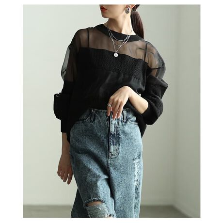 シアー素材とニットをドッキングした、表情豊かなプルオーバー。透け感のあるオーガンジーとニットのボーダー模様が重なり、着るだけで軽やかで今っぽい印象に。シンプルなボトムス合わせでもしっかり映える一枚です!