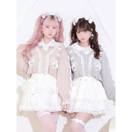 ひらりとしたレースとビジュー調を組み合わせたリボンがアクセントになるカーディガン。